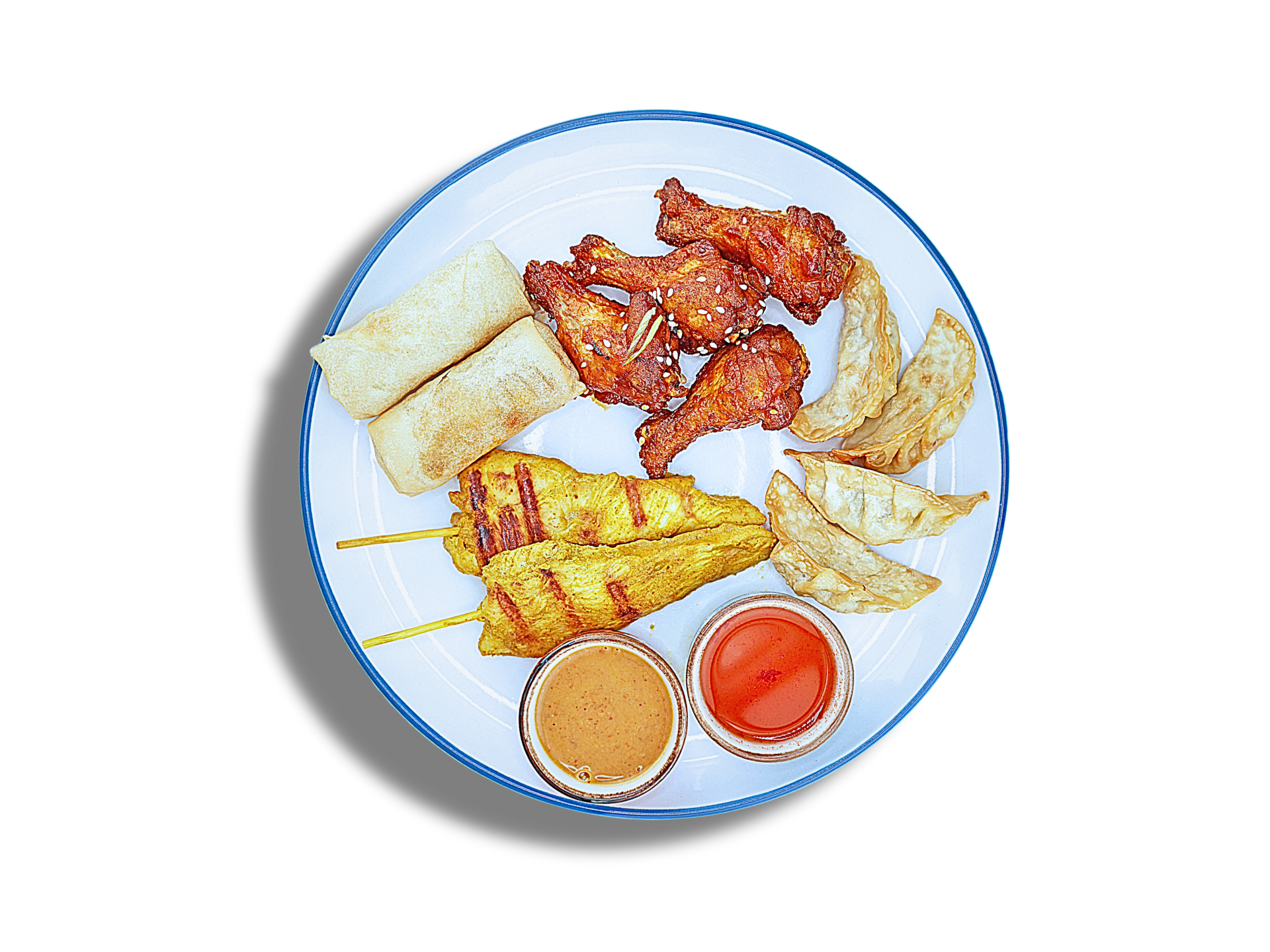 Mix of veg rolls, chili wings, skewers, chicken Gyoza served with sweet chili and peanut satay dip.