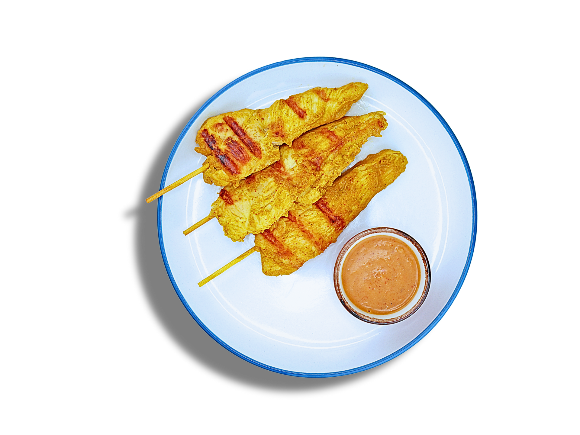 Tender marinated chicken skewers, smothered and served with peanut satay sauce.